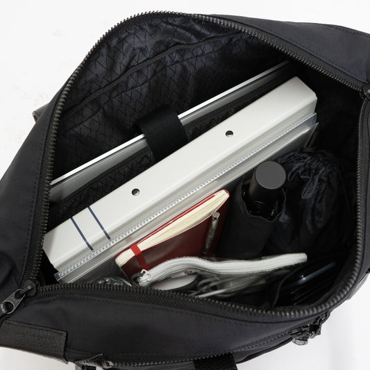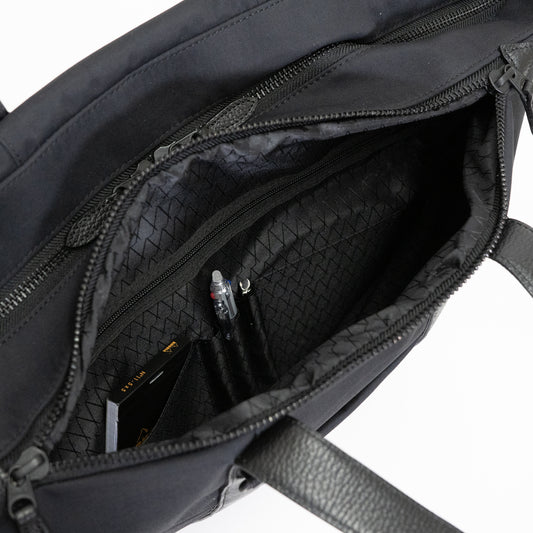 • シンプルなフェイスデザインで、ワーク・デイリーなどシーンを選ばない「Floe (フロウ)ワーク&デイリートートバッグ」。 Floe ワーク&デイリートートバックはスーツケースのハンドル部分に差し込んで固定するためのセットアップベルト付き。