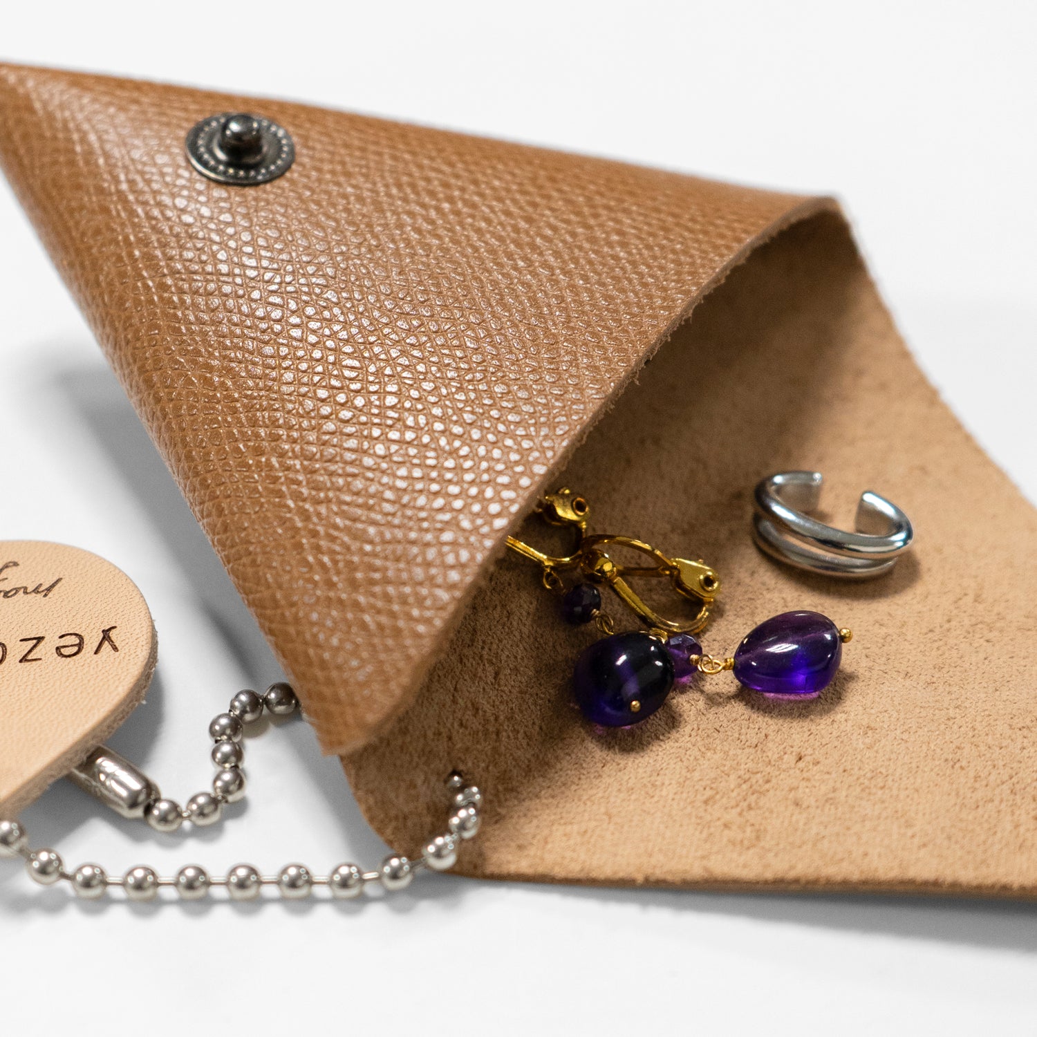 The opening is fastened with a hook on the front and back, so you can put things in and take them out from either side. It can be used to store coins as well as accessories.