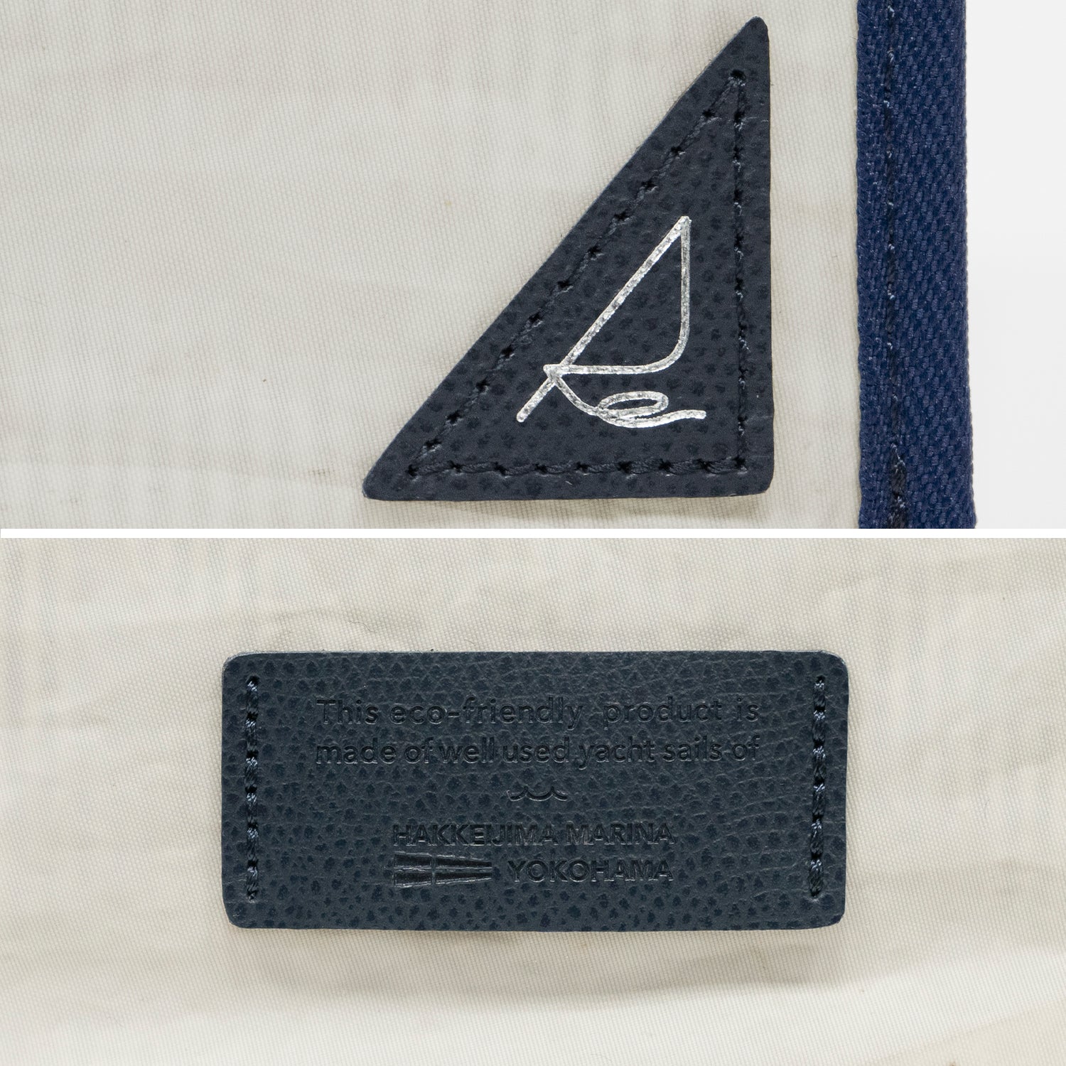 The yacht sails used by the Yacht Club of a sports university affiliated with Hakkeijima Marina for practice and competitions have been upcycled into the main material. After cleaning the fabric that would have been discarded, we selected the parts that could be reused and carefully sewed them in Japan.