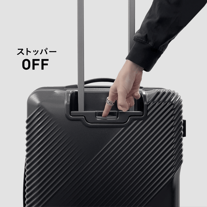 It can be easily operated with a switch on hand, and is equipped with a caster stopper function to prevent unexpected movement on buses, trains, slopes, etc. Push the button all the way down to lock it, and push it again to return it to its original position to unlock it.