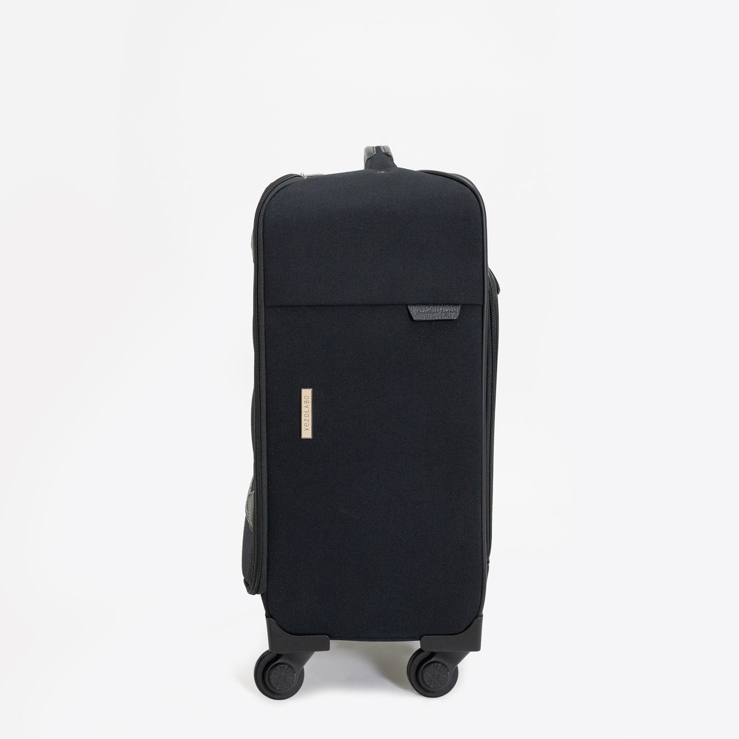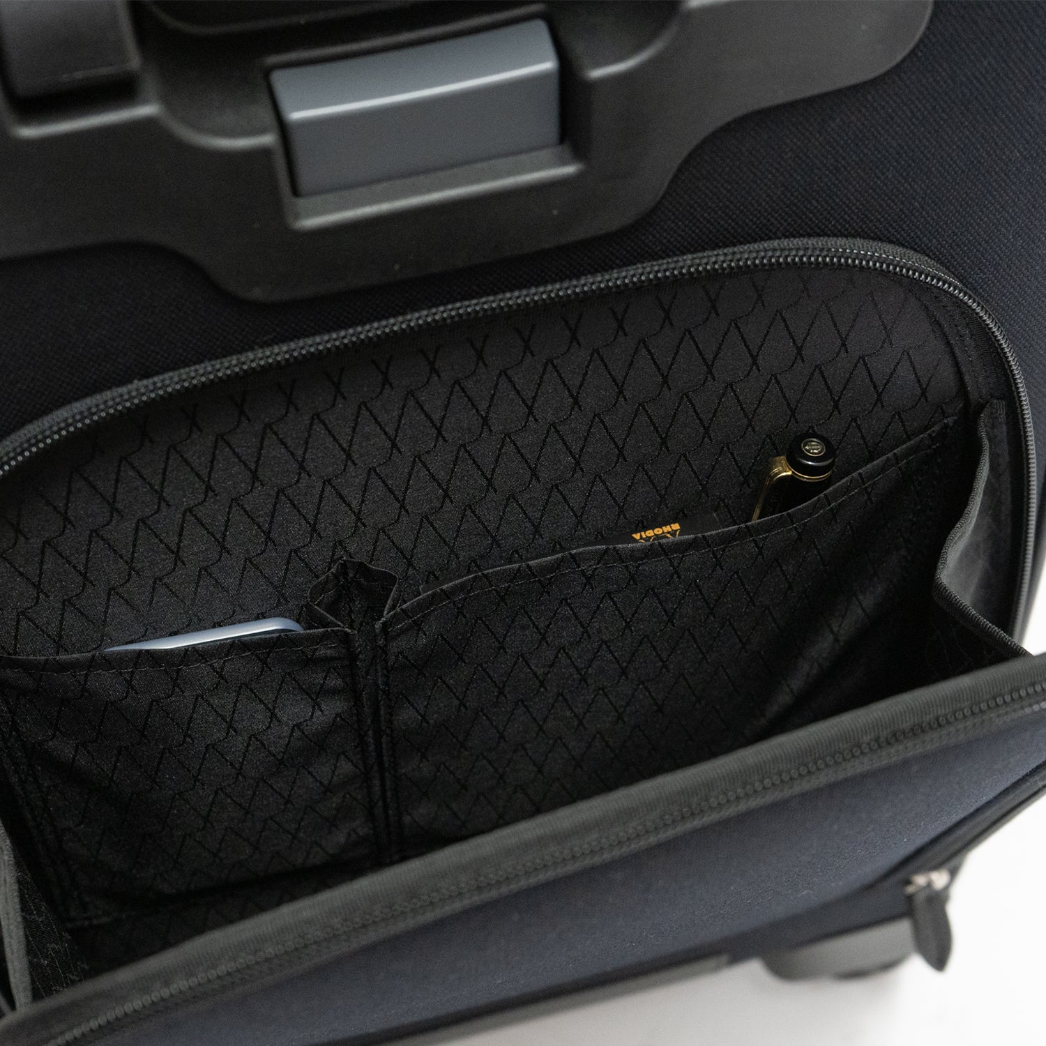 くるくると丸めながら折り畳めるフロントパネルが特徴的なソフトスーツケースです。