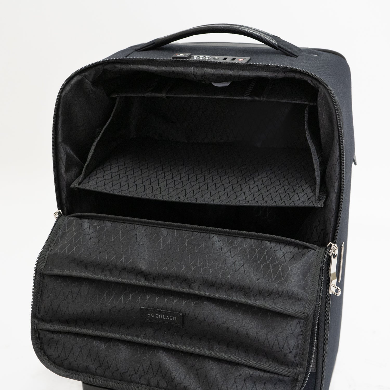狭いスペースでも場所を取らずに開閉できるので、荷造りのほか移動中の荷物の出し入れ、また営業活動でのカタログやサンプルの持ち運びなどにも有用です。スーツケースを立てたまま電車内で荷物を取り出す際に実用的な仕切り段を内装に配しています。