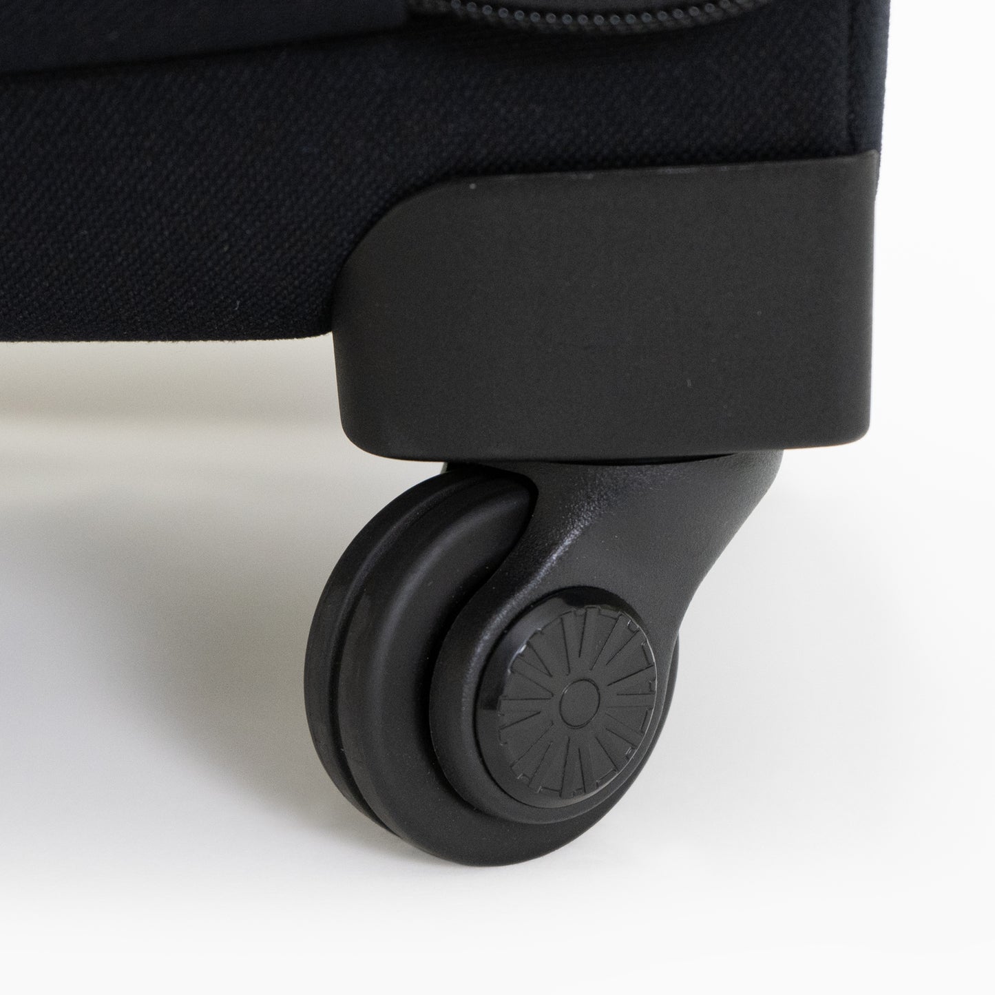 手元のスイッチで簡単に操作でき、バスや電車、坂道などで不意な走行を防ぐワンプッシュキャスターストッパー搭載「Haybale ローラブルソフトスーツケース」